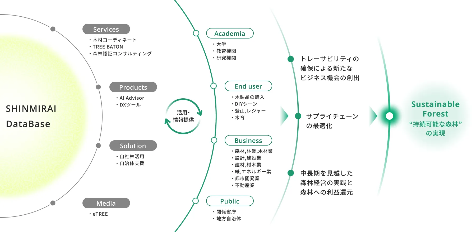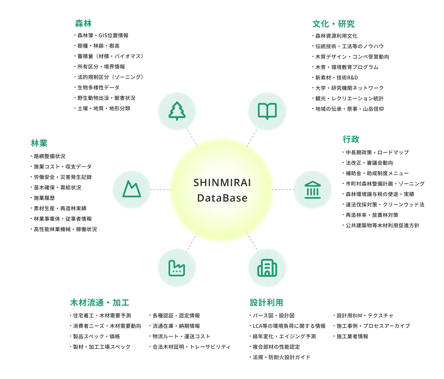 SHINMIRAI DataBaseは、川上の森林分野から川下の利用分野、さらにはそれを取り巻く制度・文化まで、森林産業のあらゆるレイヤーを網羅しています。私たちはこれらのデータをリアルタイムで更新し有機的に結びつけることで、産業全体の持続可能な発展と、新たな価値創造の可能性を追求していきます。