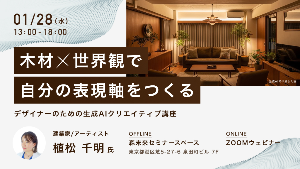 2026年1月28日(水)に植松 千明氏(建築家/アーティスト)を講師とした木材×世界観で自分の表現軸をつくる 〜デザイナーのための生成AIクリエイティブ講座〜を開催いたします。